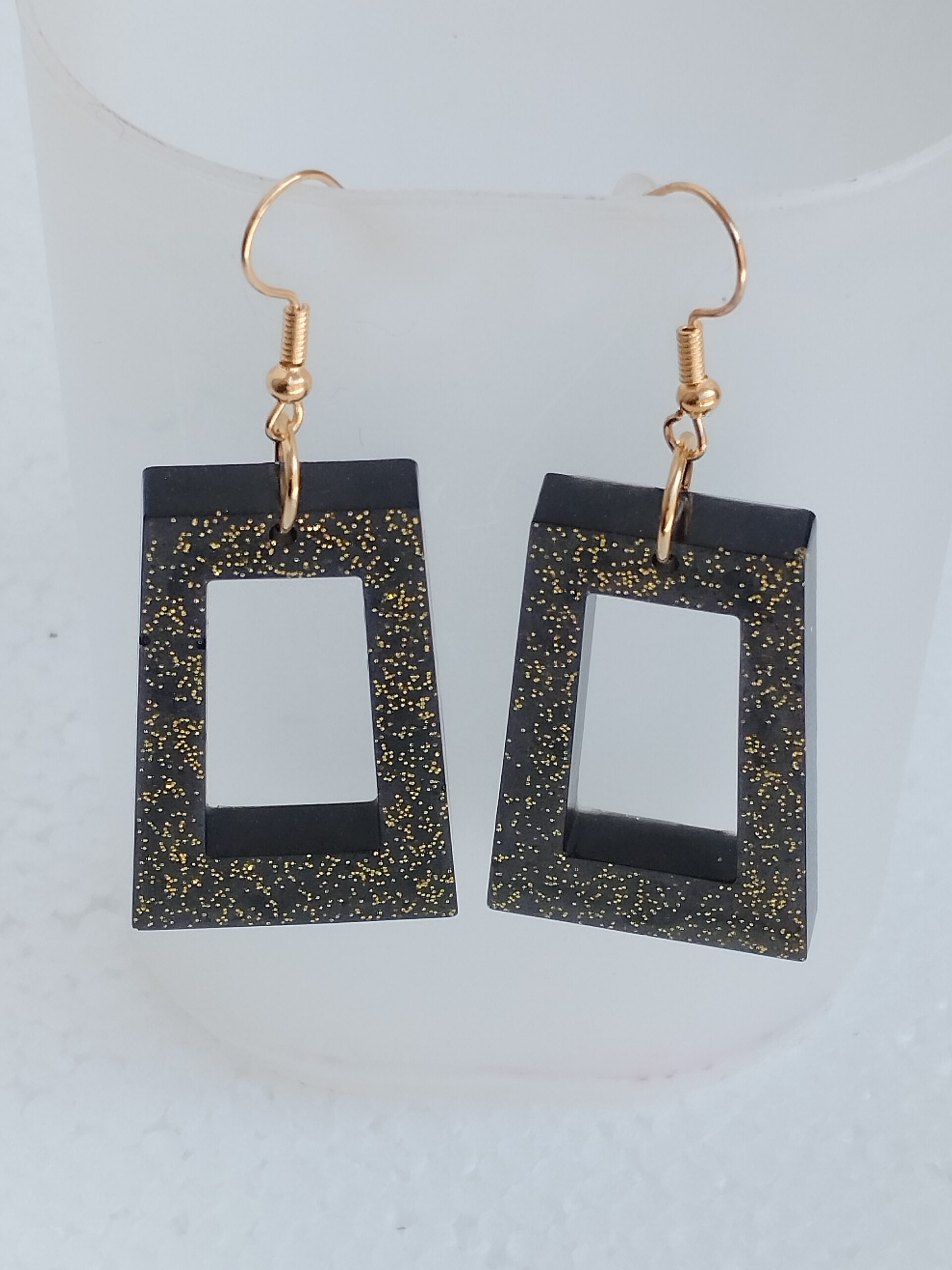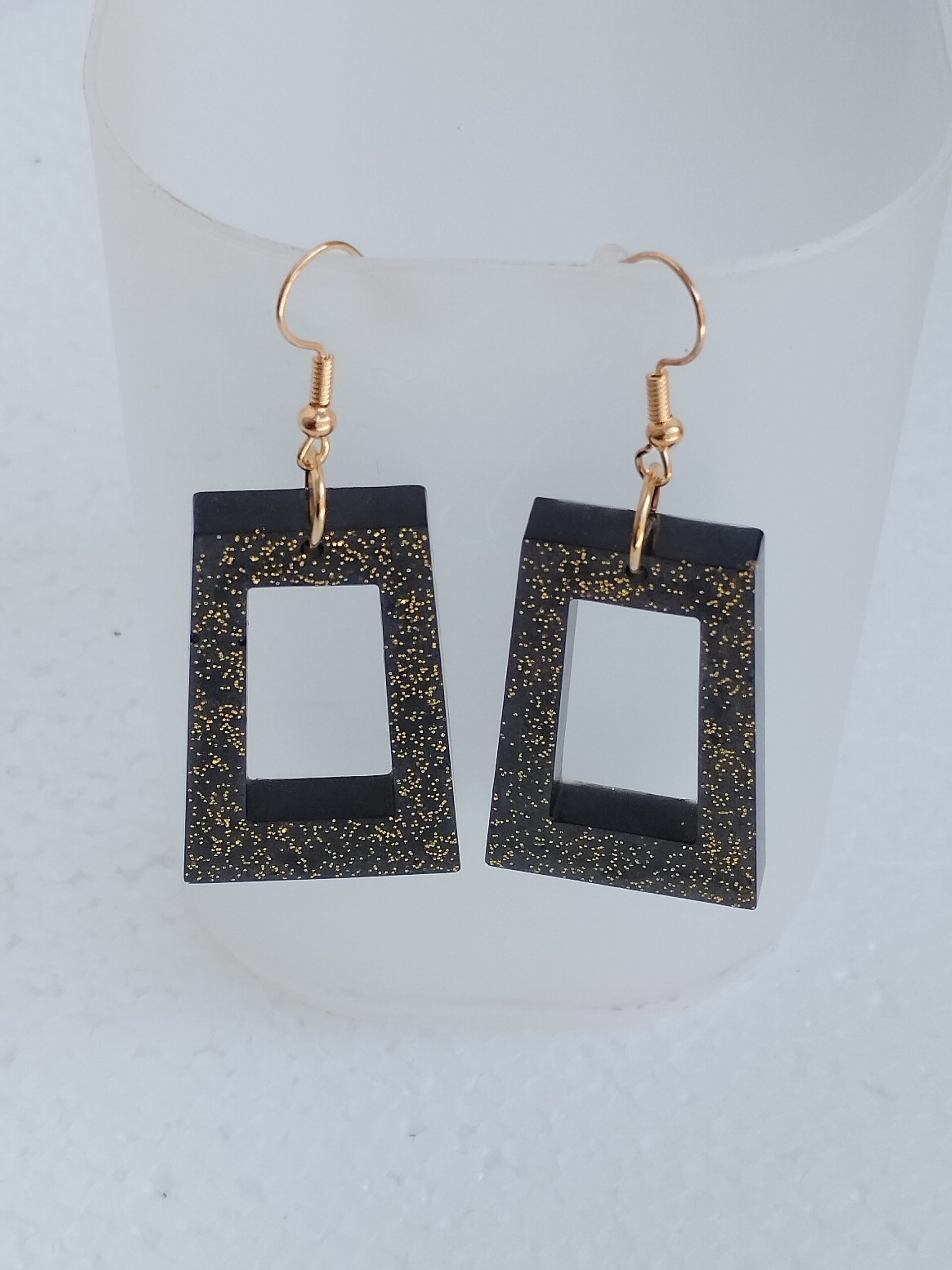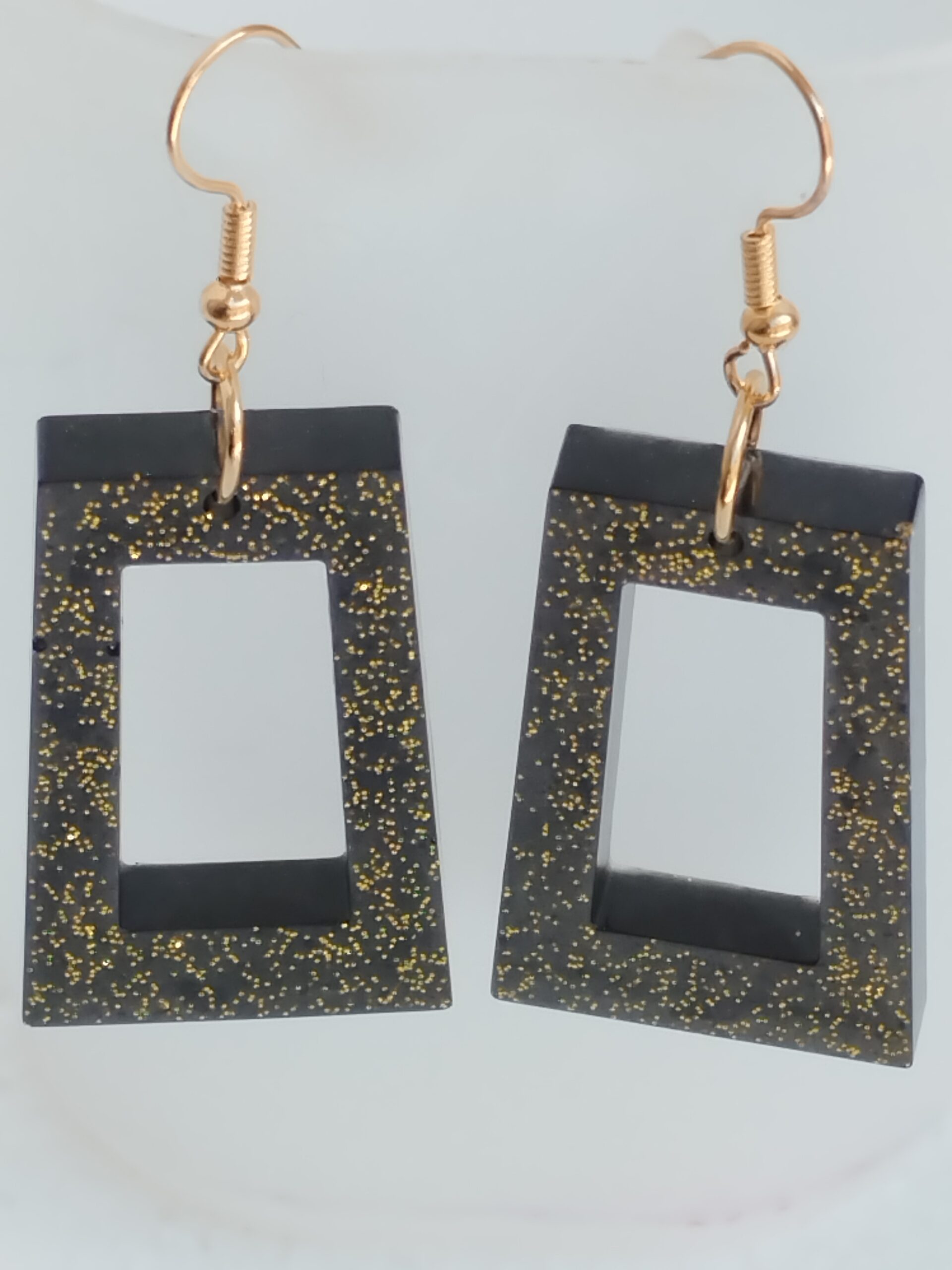 Boucles d’oreilles rectangles en résine noire avec éclats dorés, montées sur crochets en acier inoxydable. Élégantes, légères et résistantes.