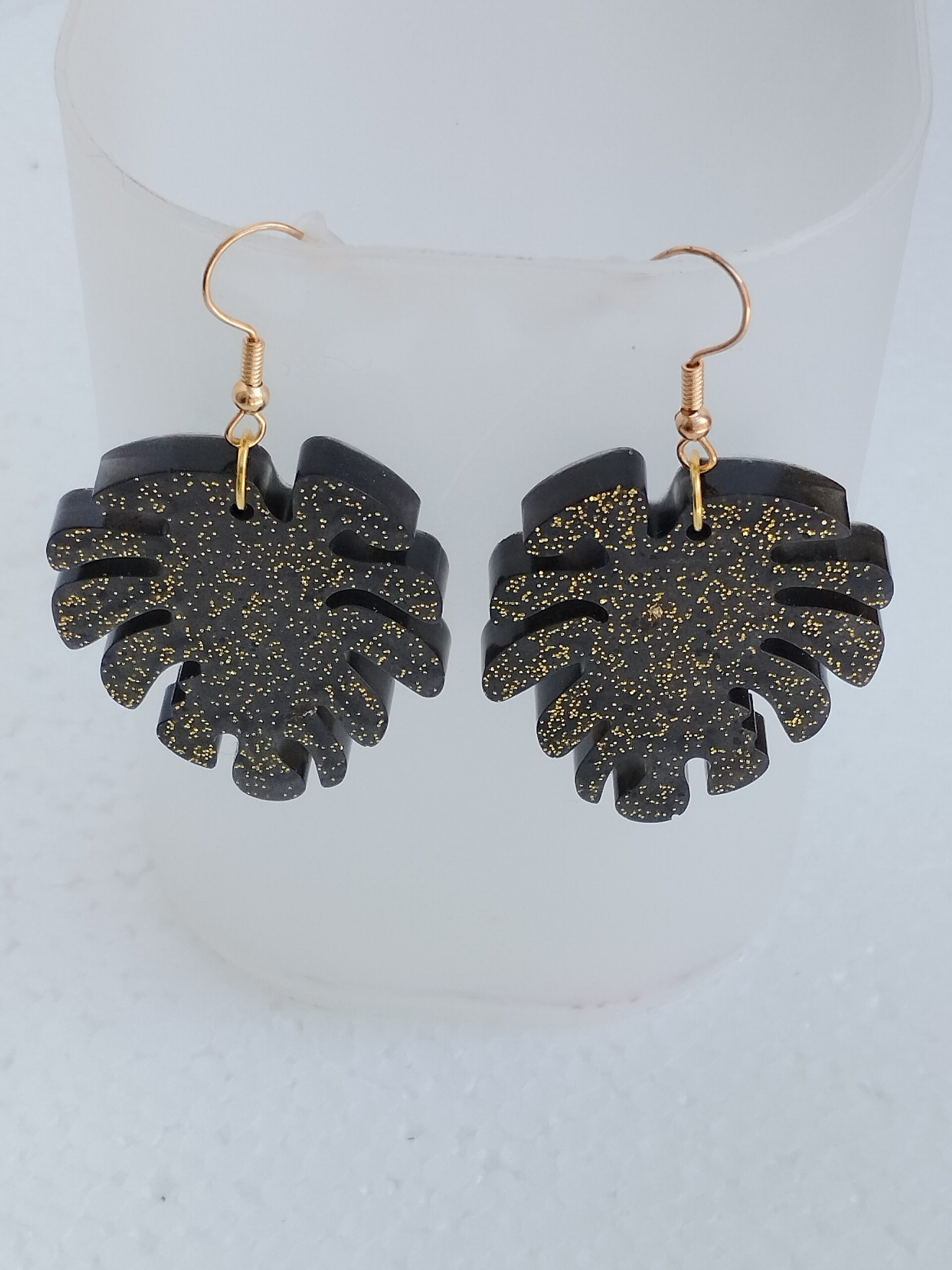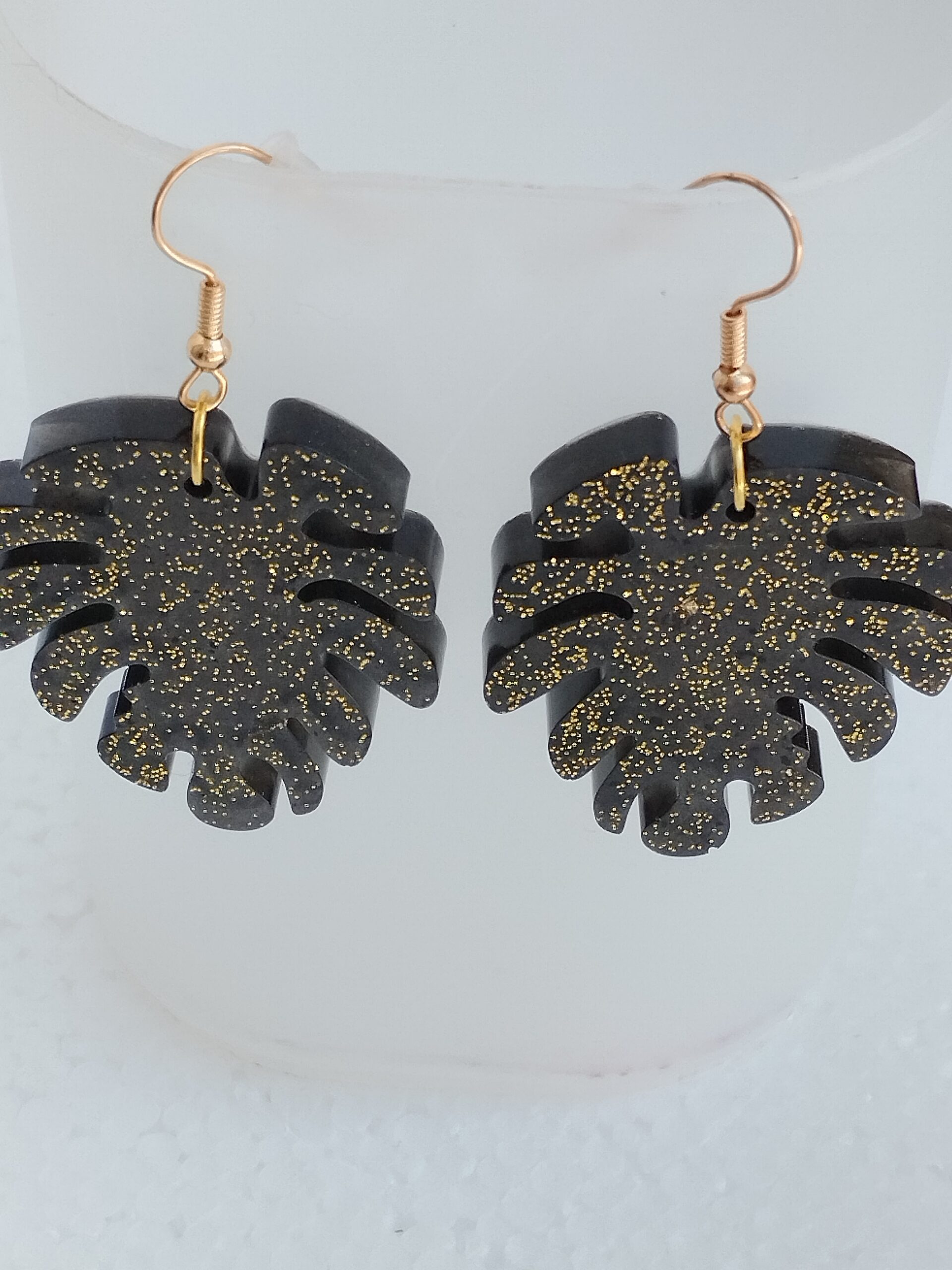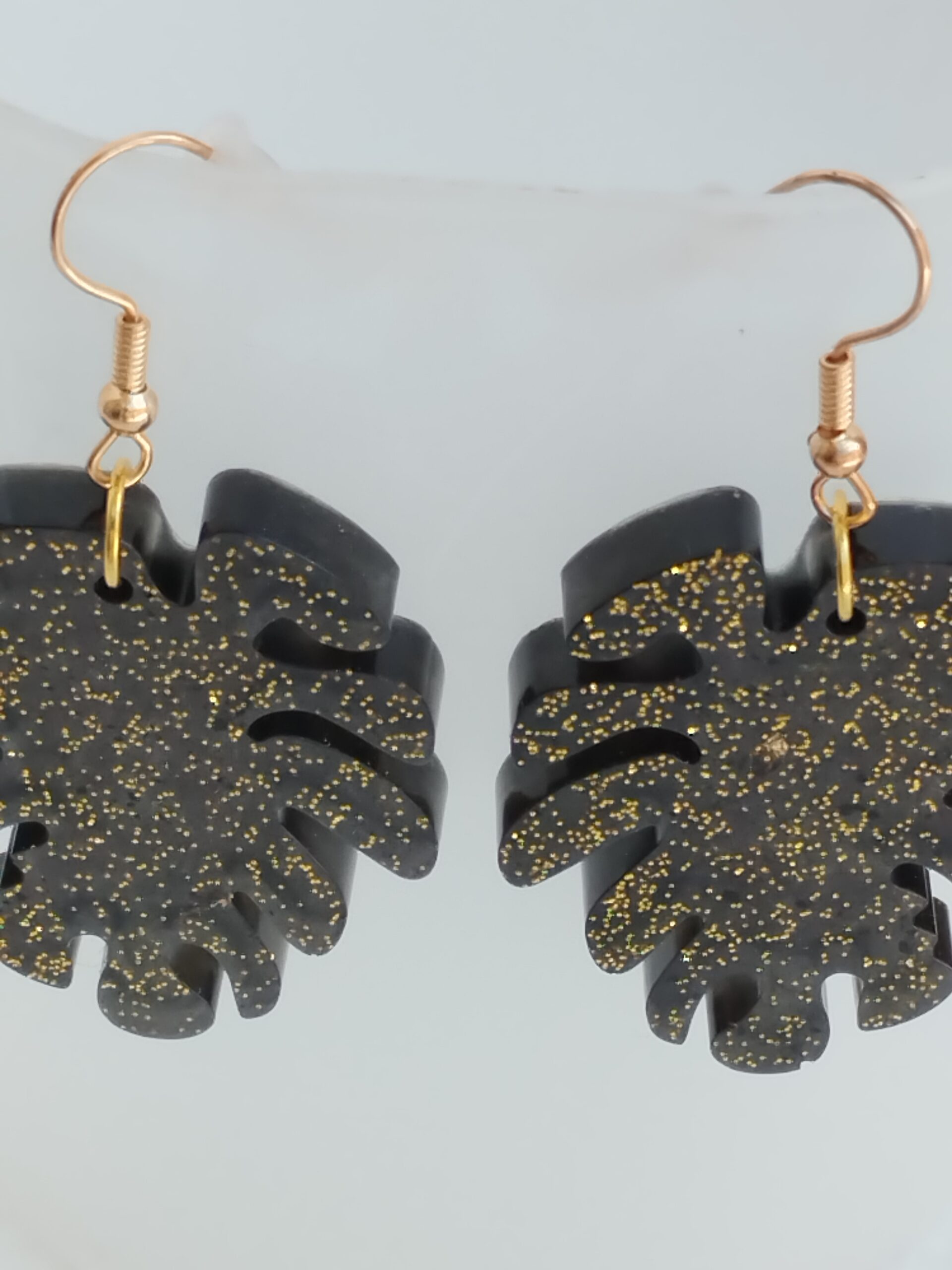 Boucles d’oreilles pendantes en forme de feuille, en résine noire ornée de fines paillettes dorées, montées sur crochets en acier inoxydable.