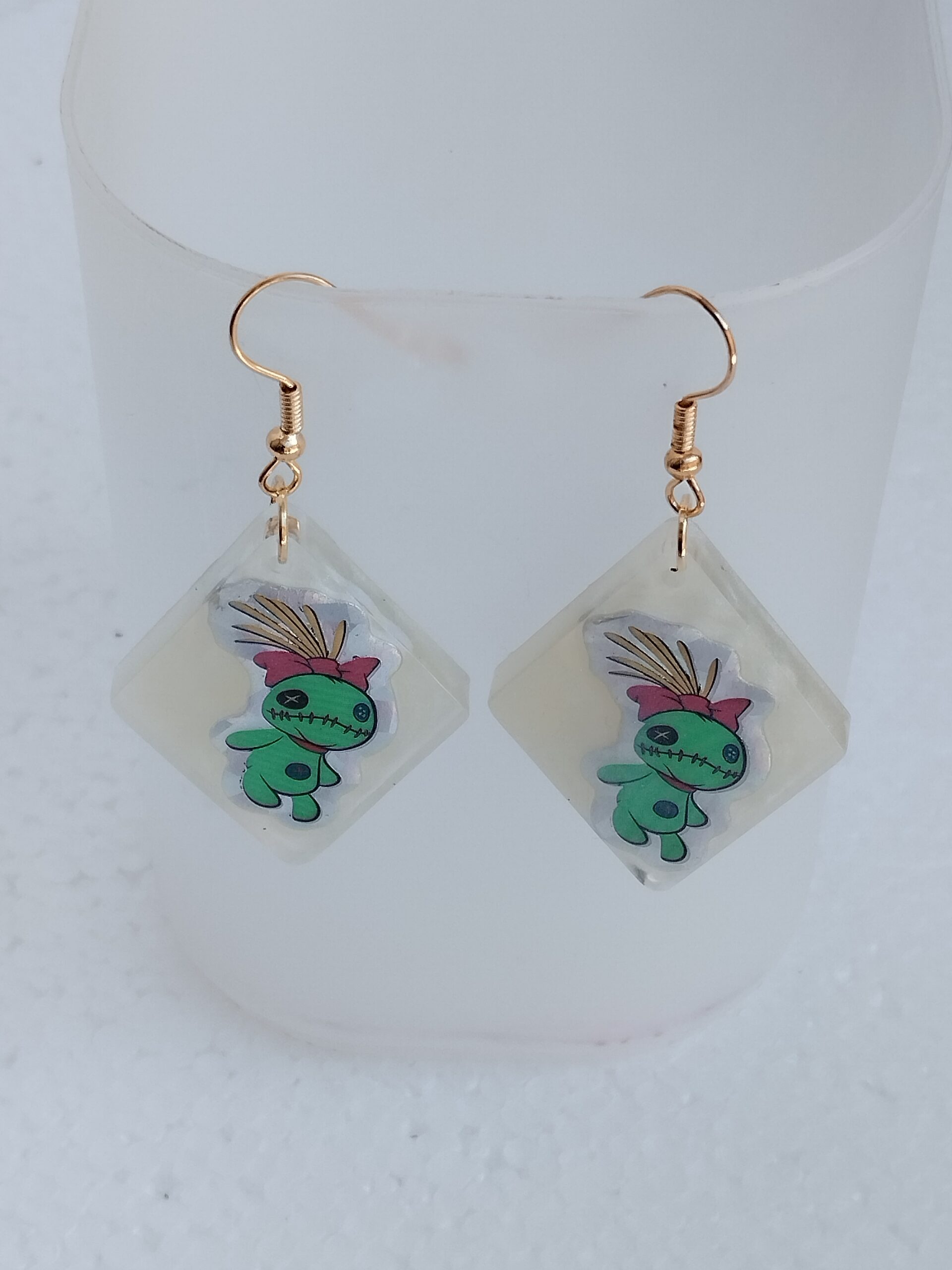 Boucles originales en résine blanche laiteuse, incrustées d’un personnage poupée stylisé, montées sur crochets dorés inoxydables.