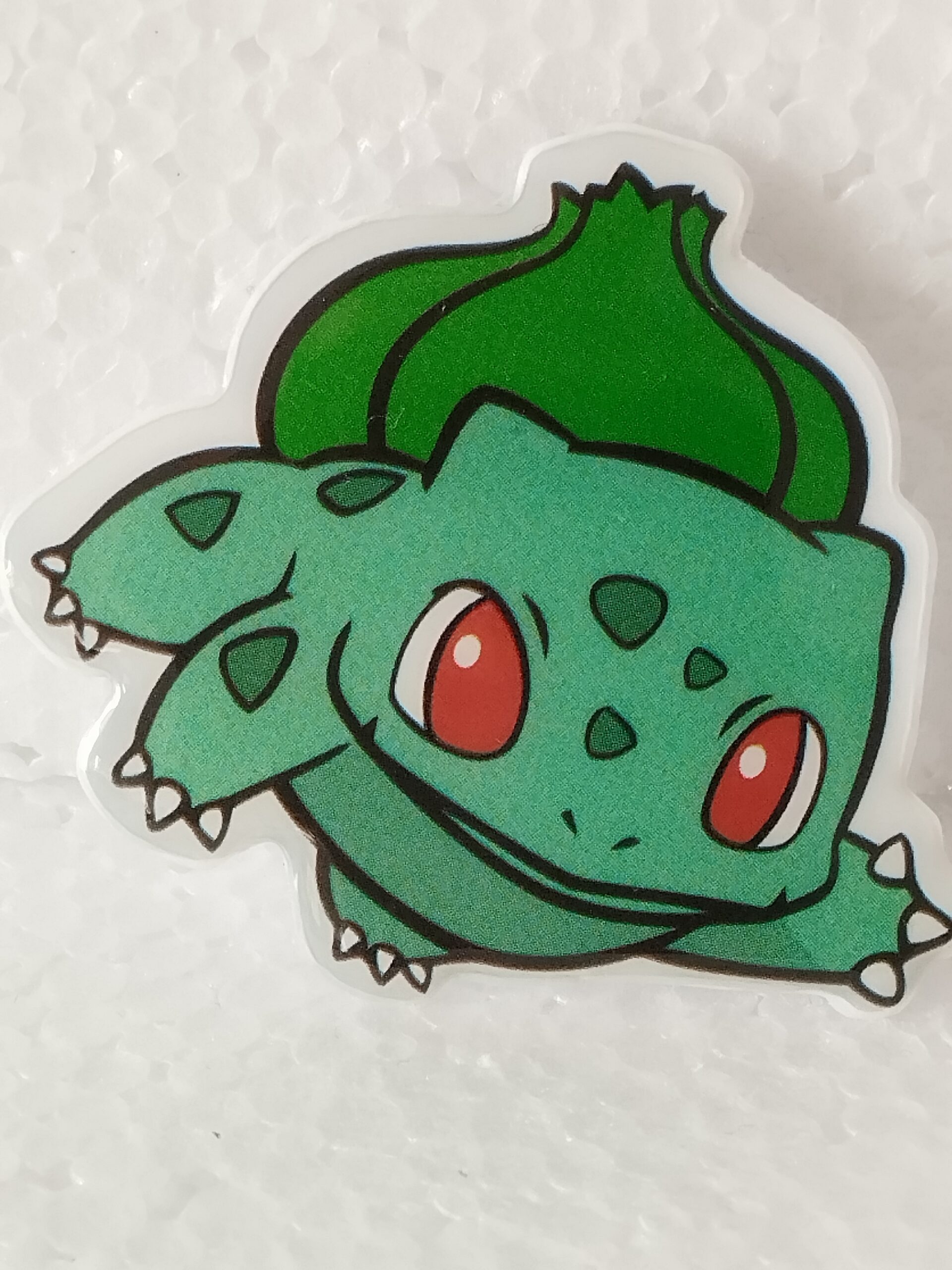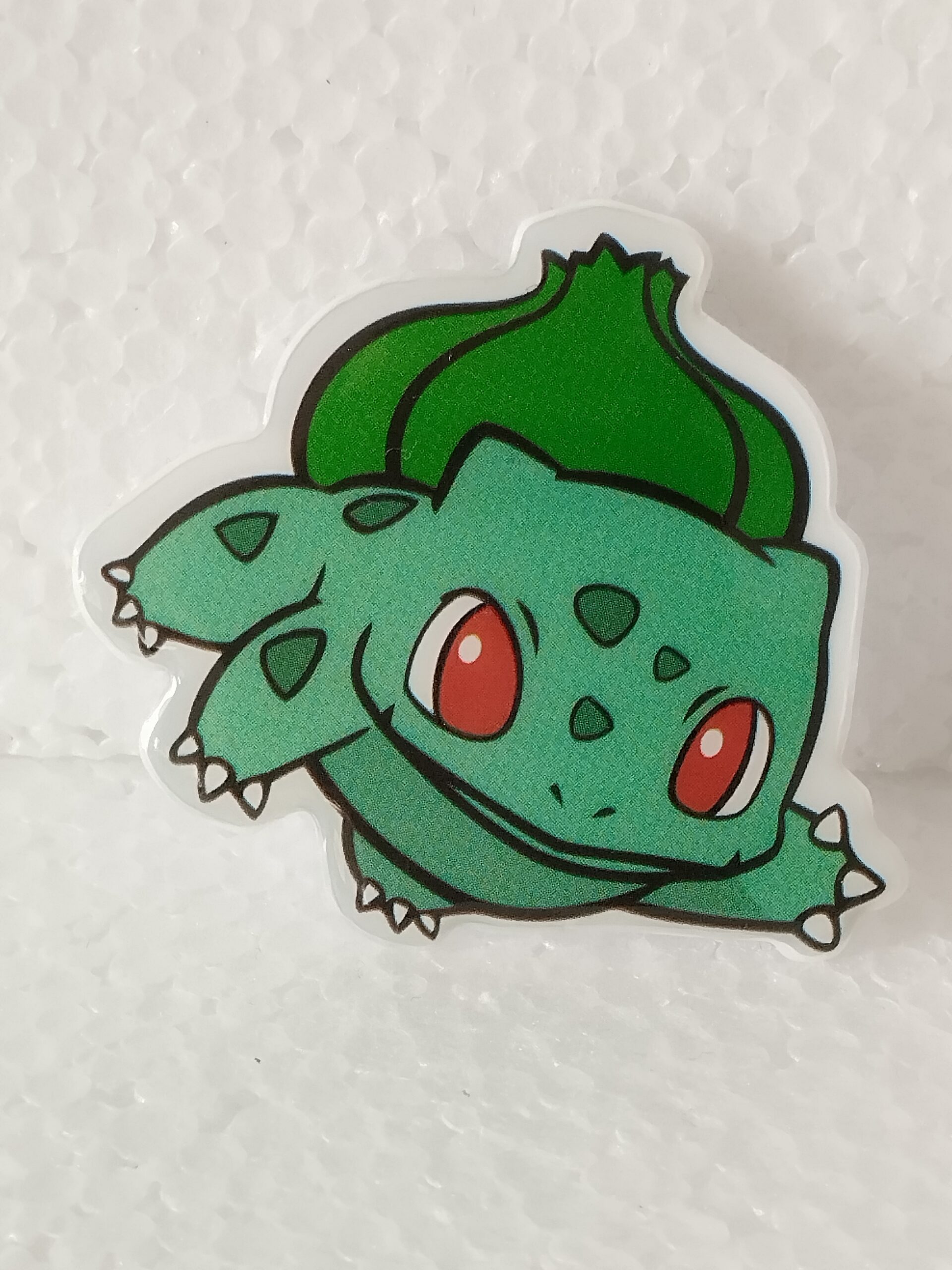 Broche en résine artisanale illustrant Bulbizarre, le Pokémon plante emblématique. Un accessoire coloré et adorable pour les fans de l’univers Pokémon.