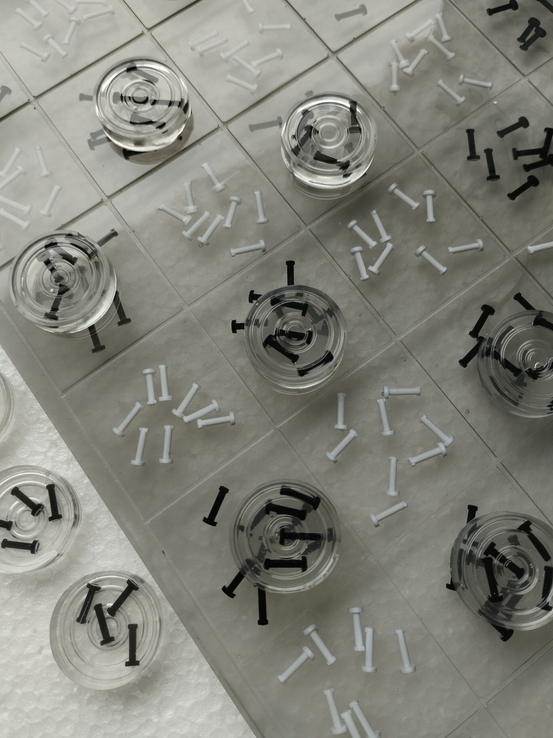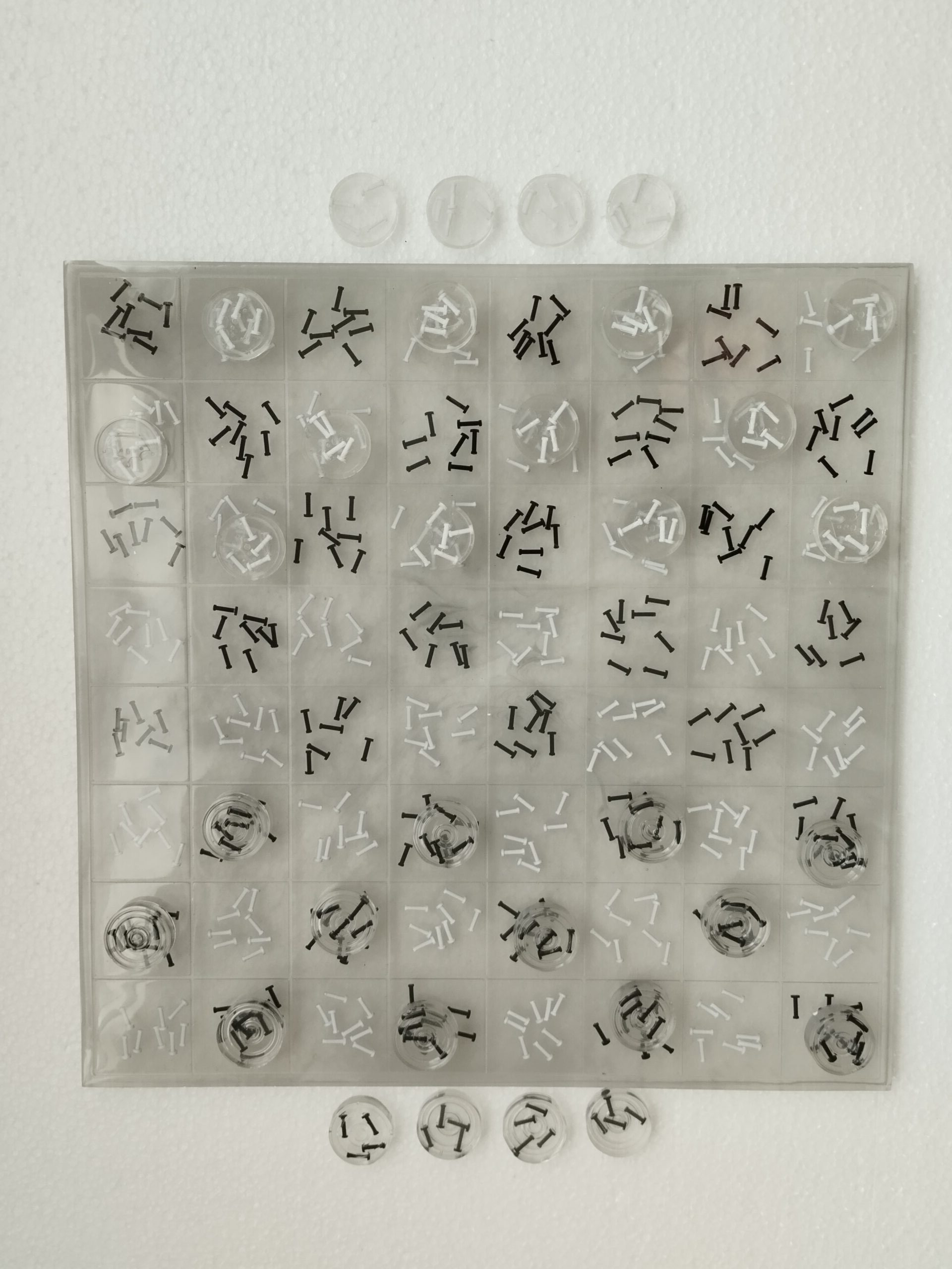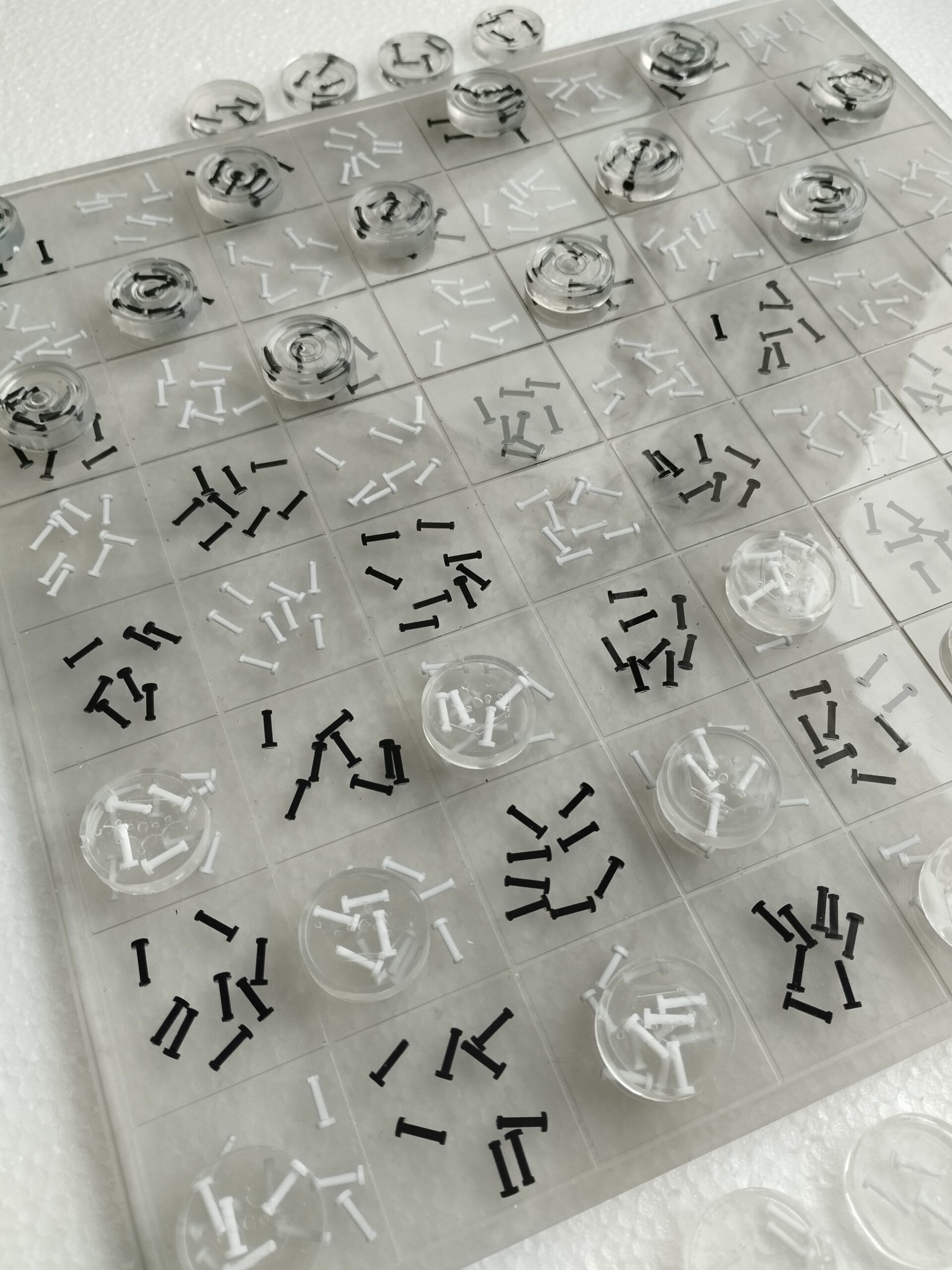 Design : Abstrait noir et blanc pour le plateau, pions assortis.