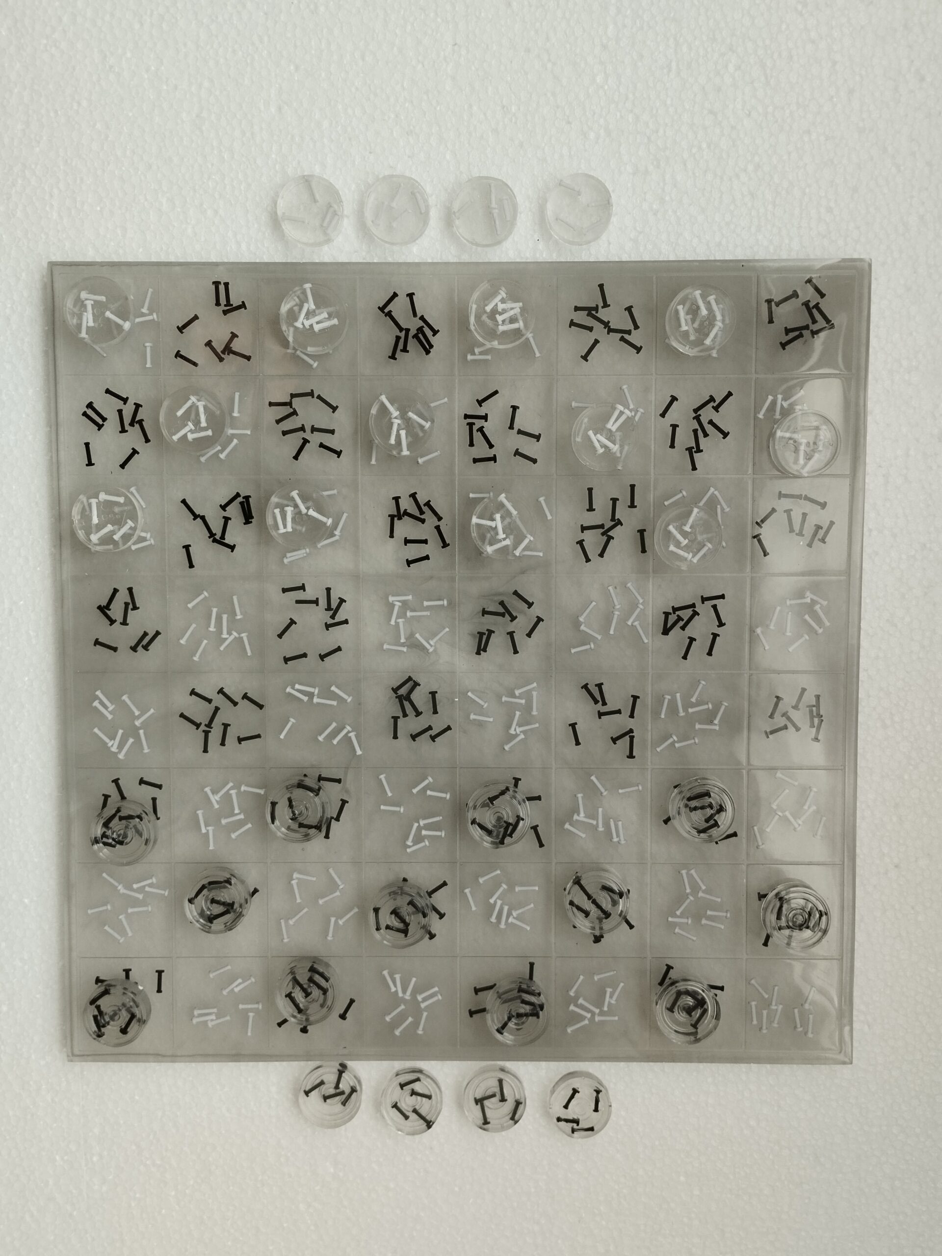 Ce set complet comprend un plateau décoré de motifs noirs et blancs modernes, accompagné de pions en résine réalisés à la main.