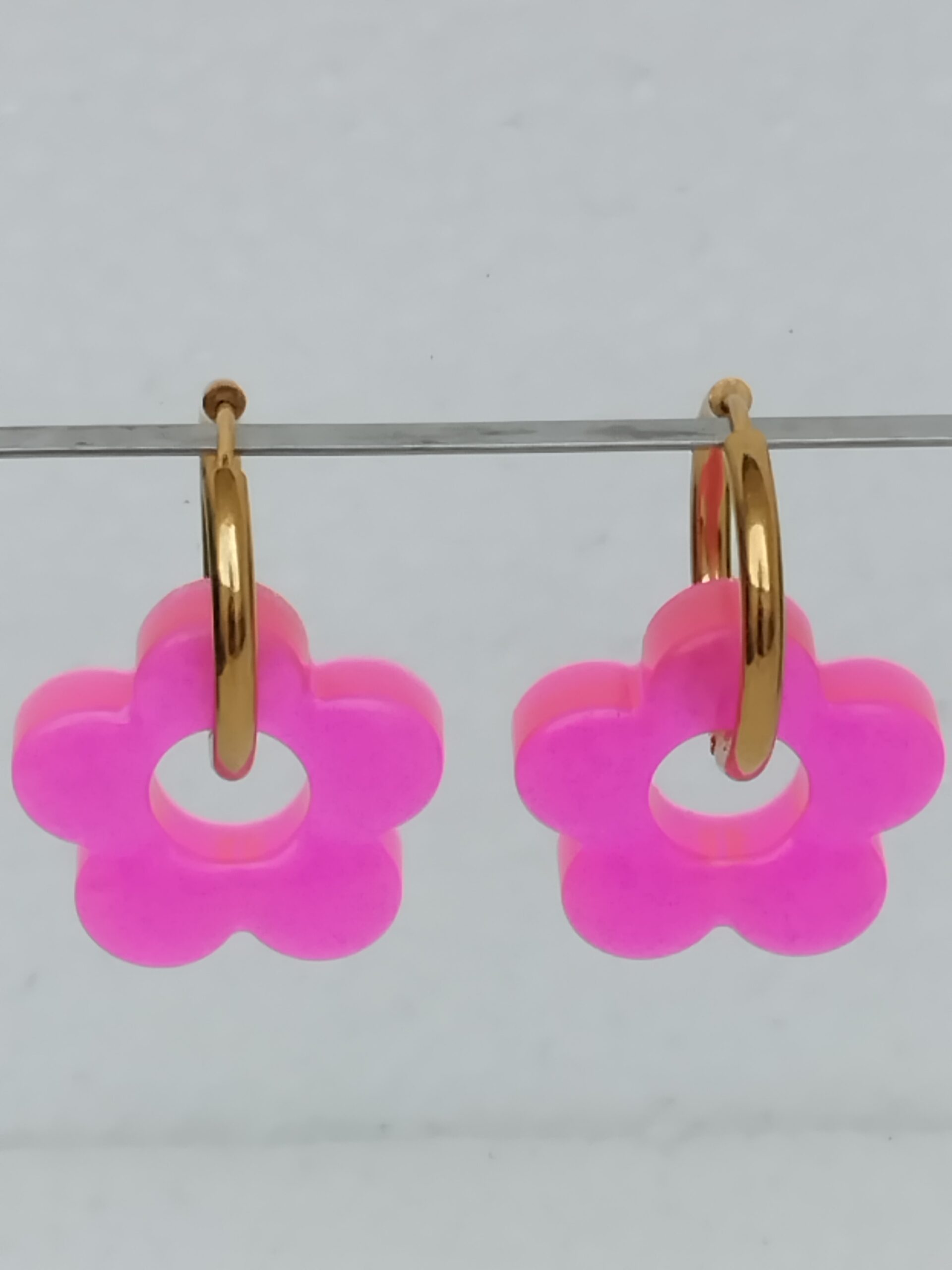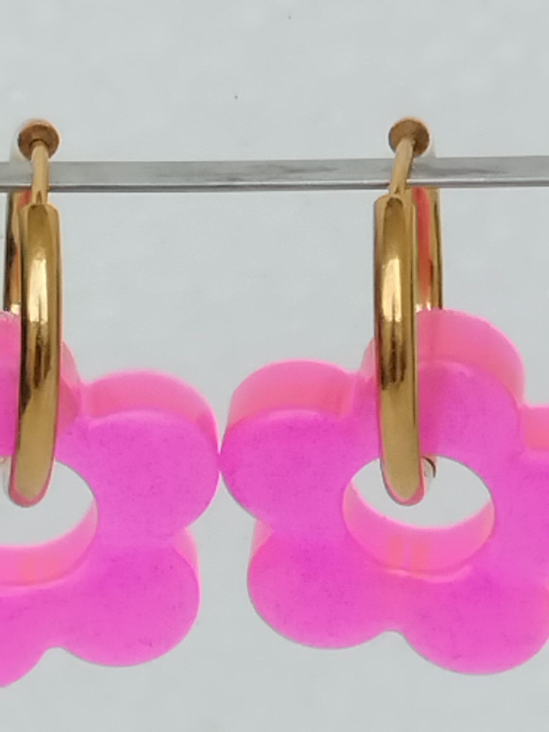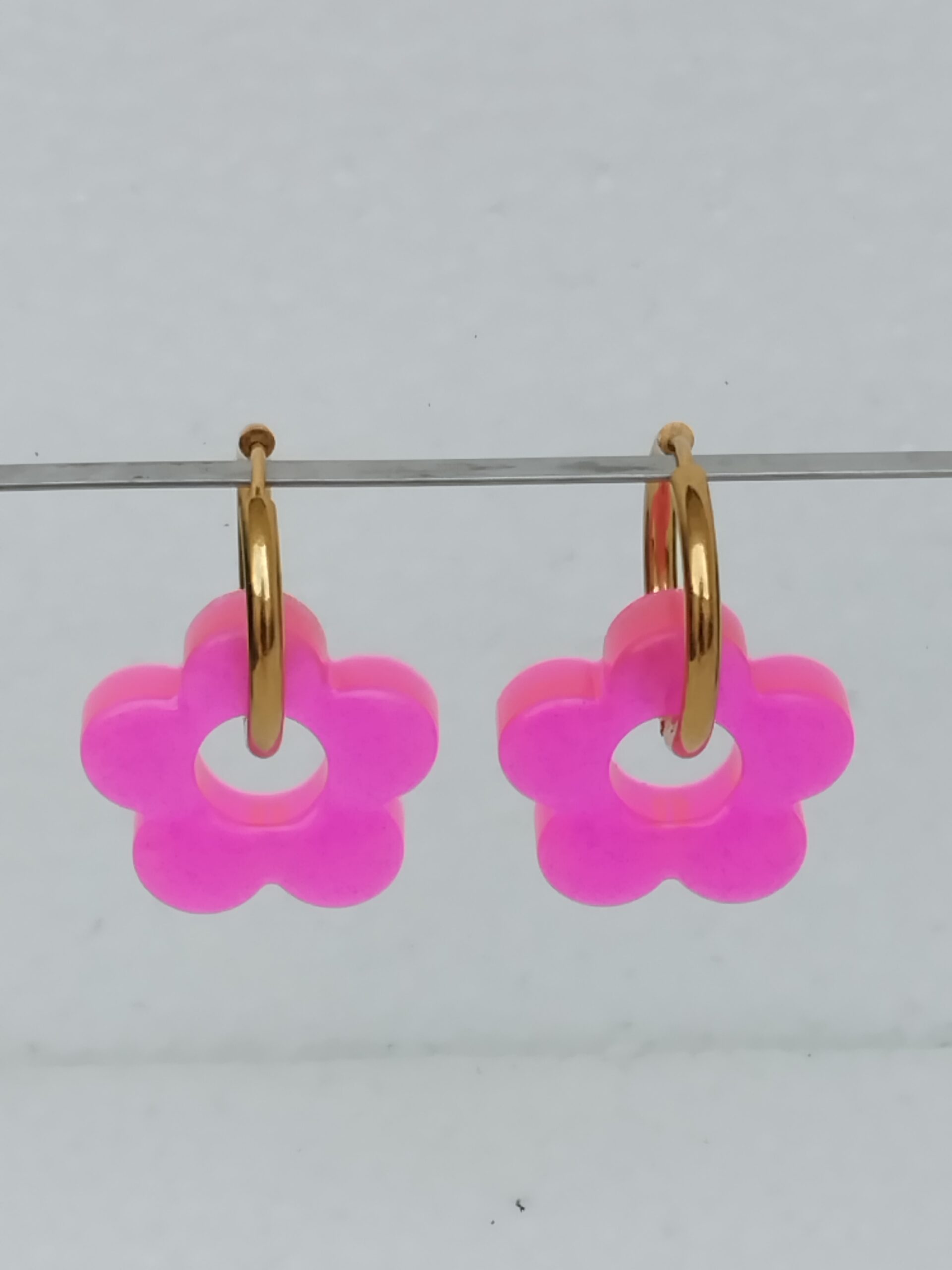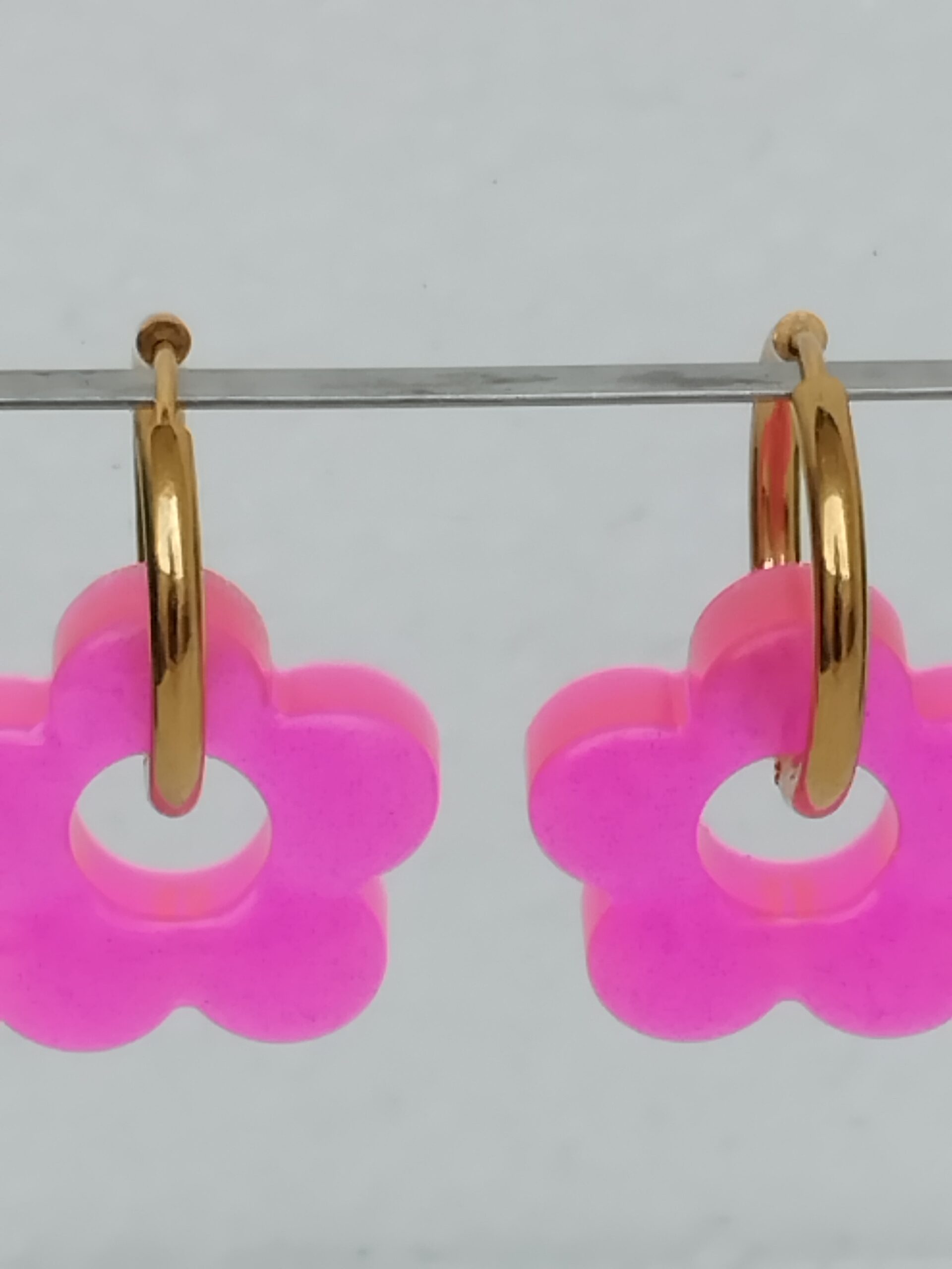 Pampilles fleur stylisée rose vif, en résine phosphorescente.