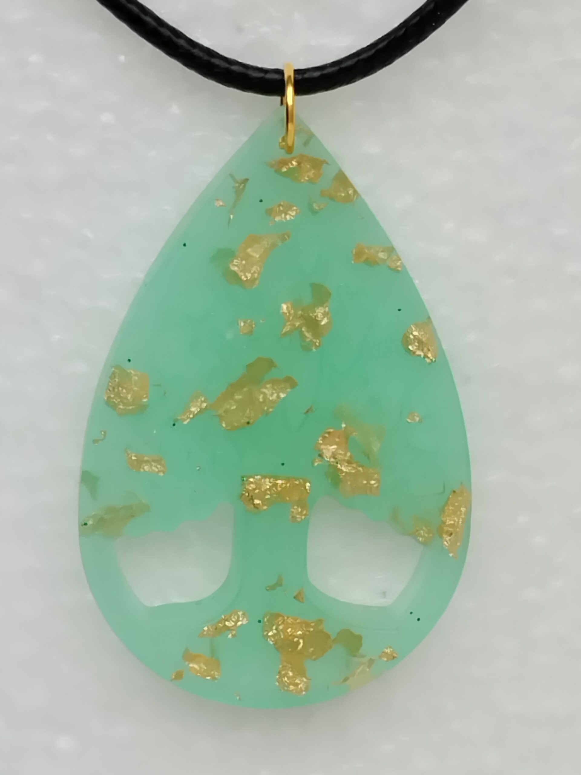 Pendentif arbre de vie en résine vert menthe avec éclats dorés, suspendu à un cordon noir de 45 cm avec chaîne d’extension de 5 cm. Un bijou raffiné, empreint de symbolisme et d’élégance.