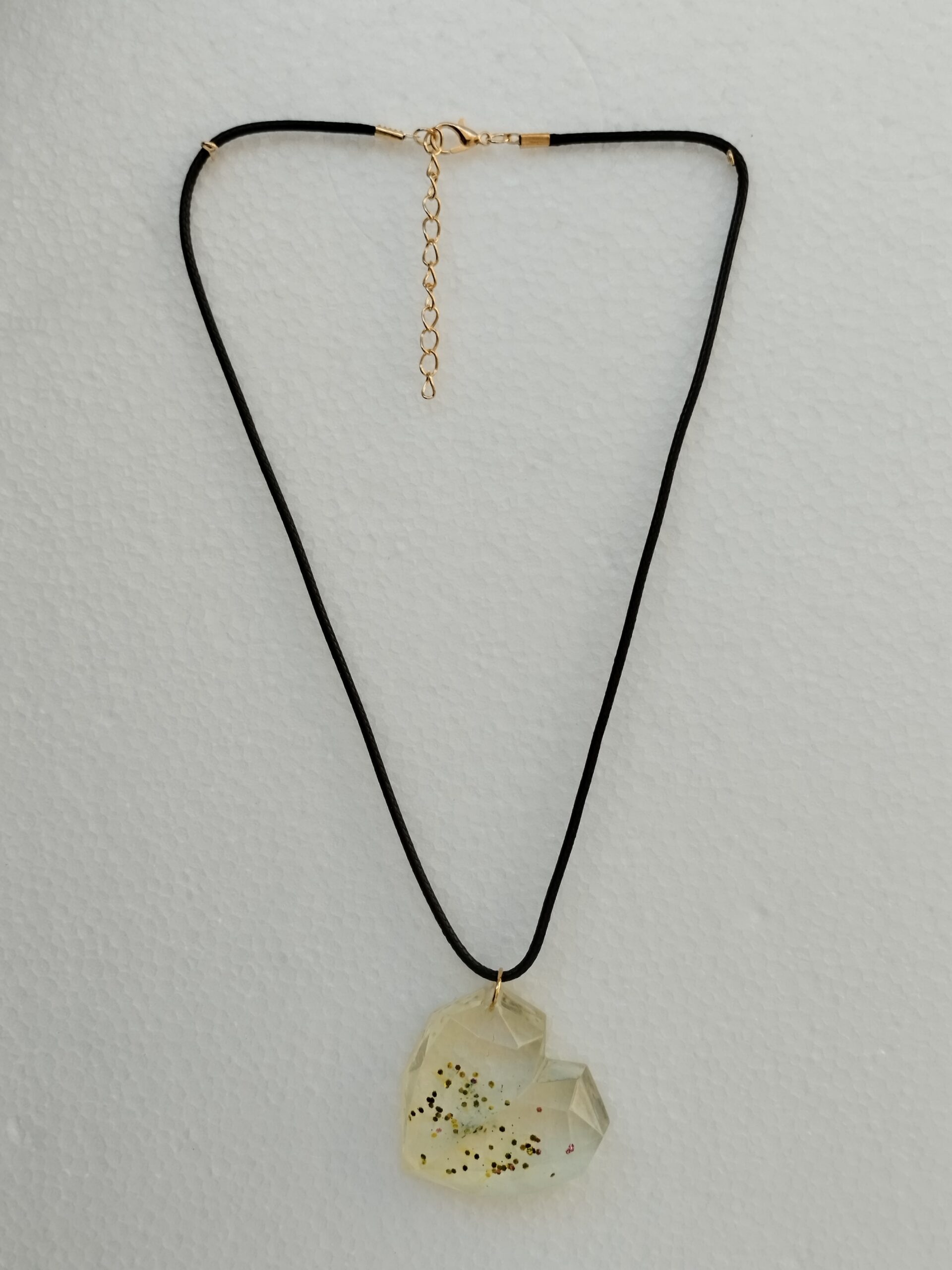 Ce pendentif en forme de cœur, fabriqué en résine transparente avec des paillettes, est suspendu à un cordon noir de 45 cm avec une extension dorée de 5 cm. Un bijou élégant et raffiné, parfait pour sublimer votre style au quotidien.