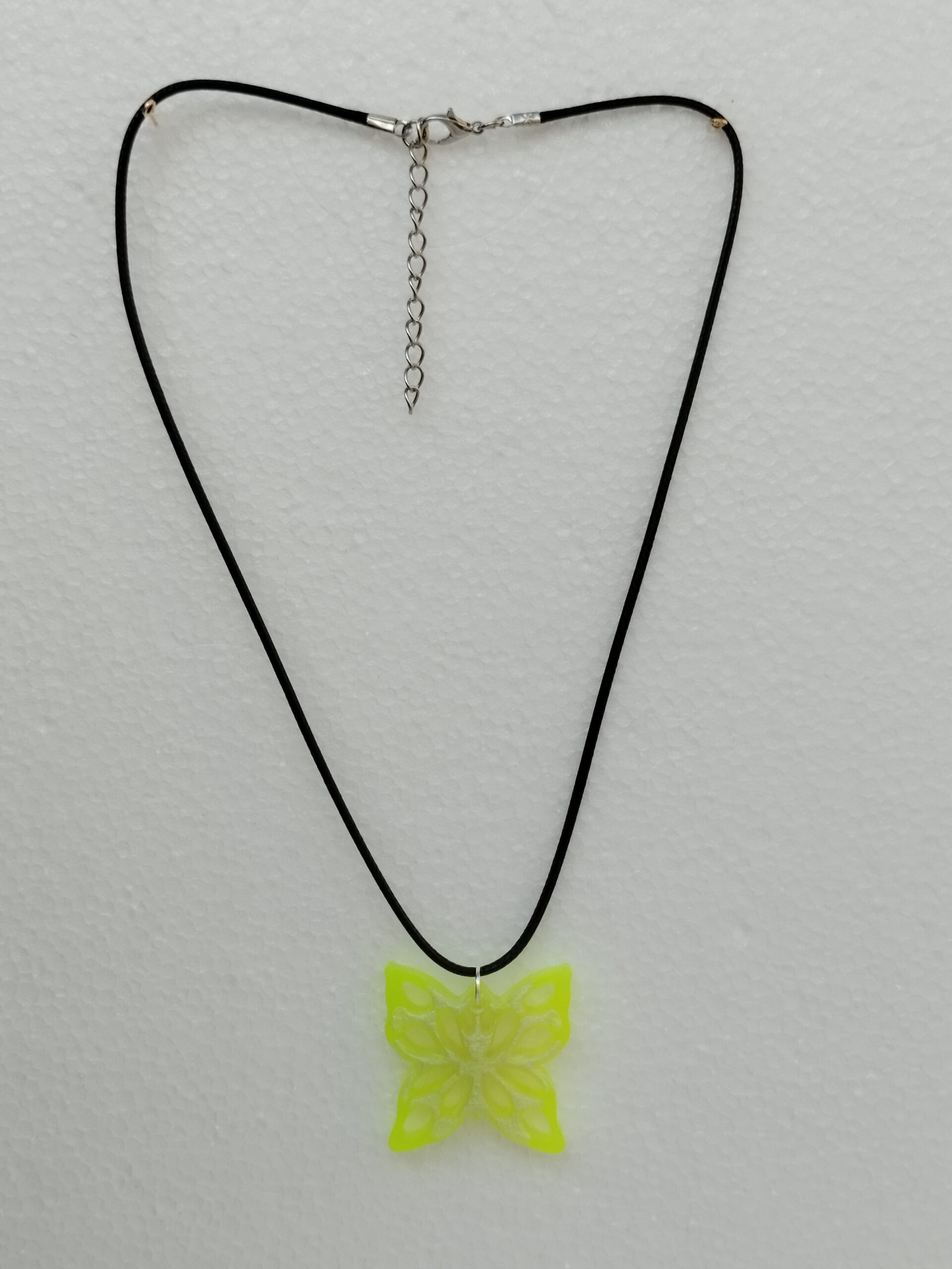 Pendentif en résine jaune en forme de papillon, monté sur un cordon noir de 45 cm avec une chaîne d’extension argentée de 5 cm. Un bijou élégant et raffiné, idéal pour sublimer toutes vos tenues.