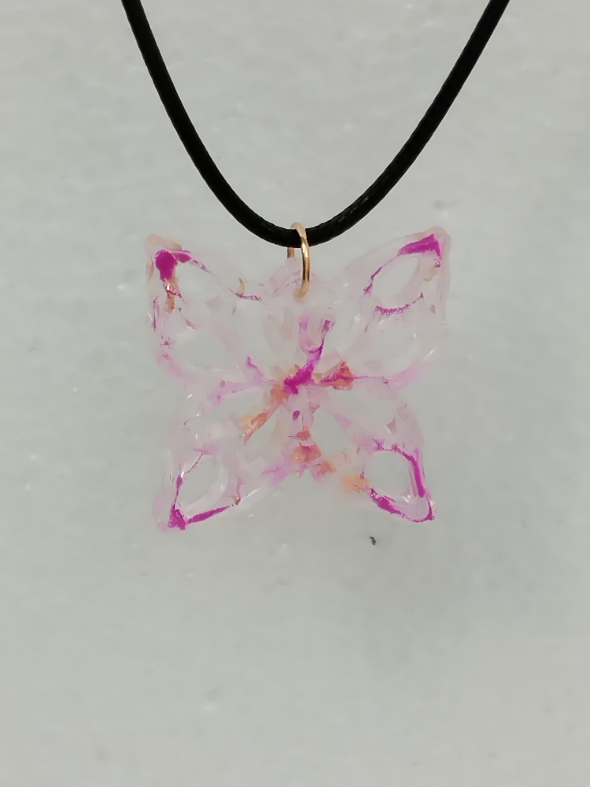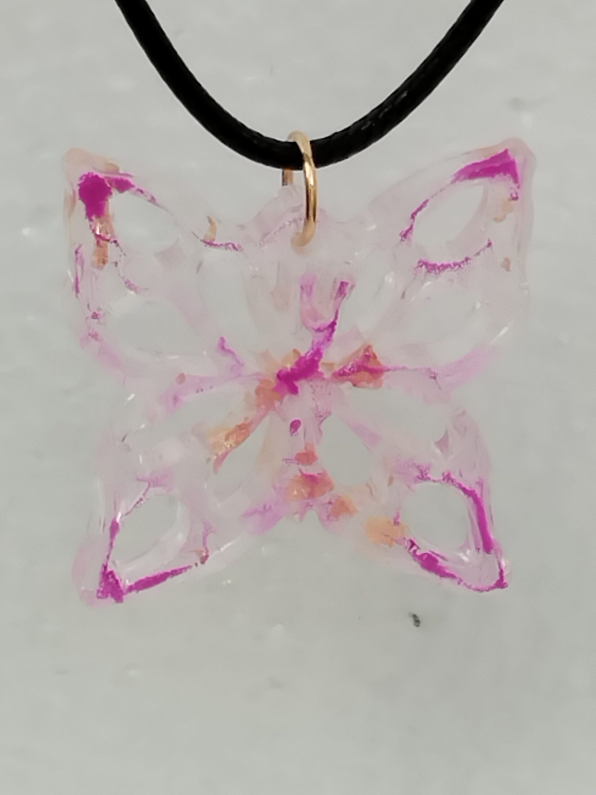 Pendentif en résine en forme de papillon, transparent avec des touches de rose fuchsia et de doré. Monté sur un cordon noir de 45 cm avec chaîne dorée de 5 cm.