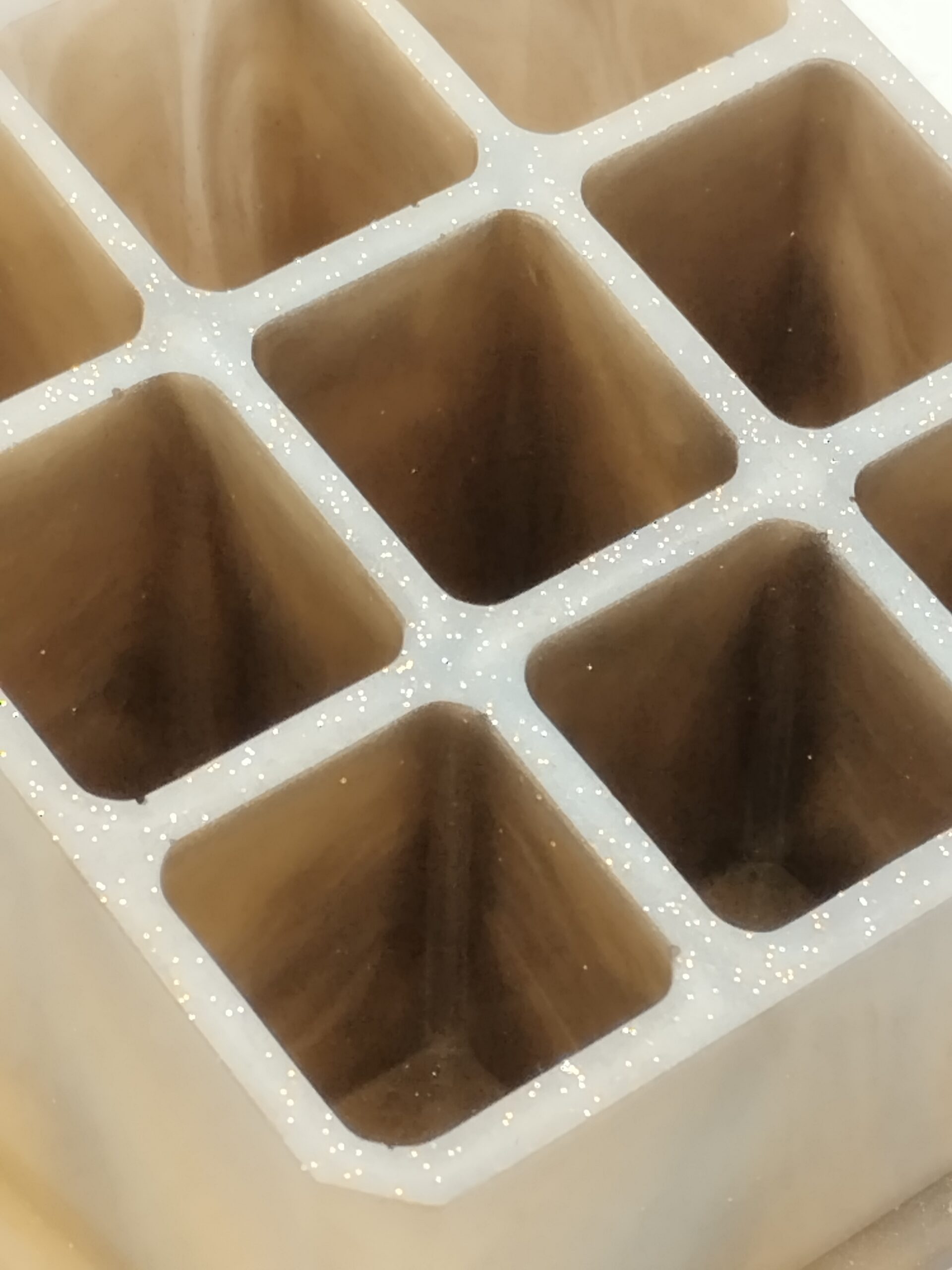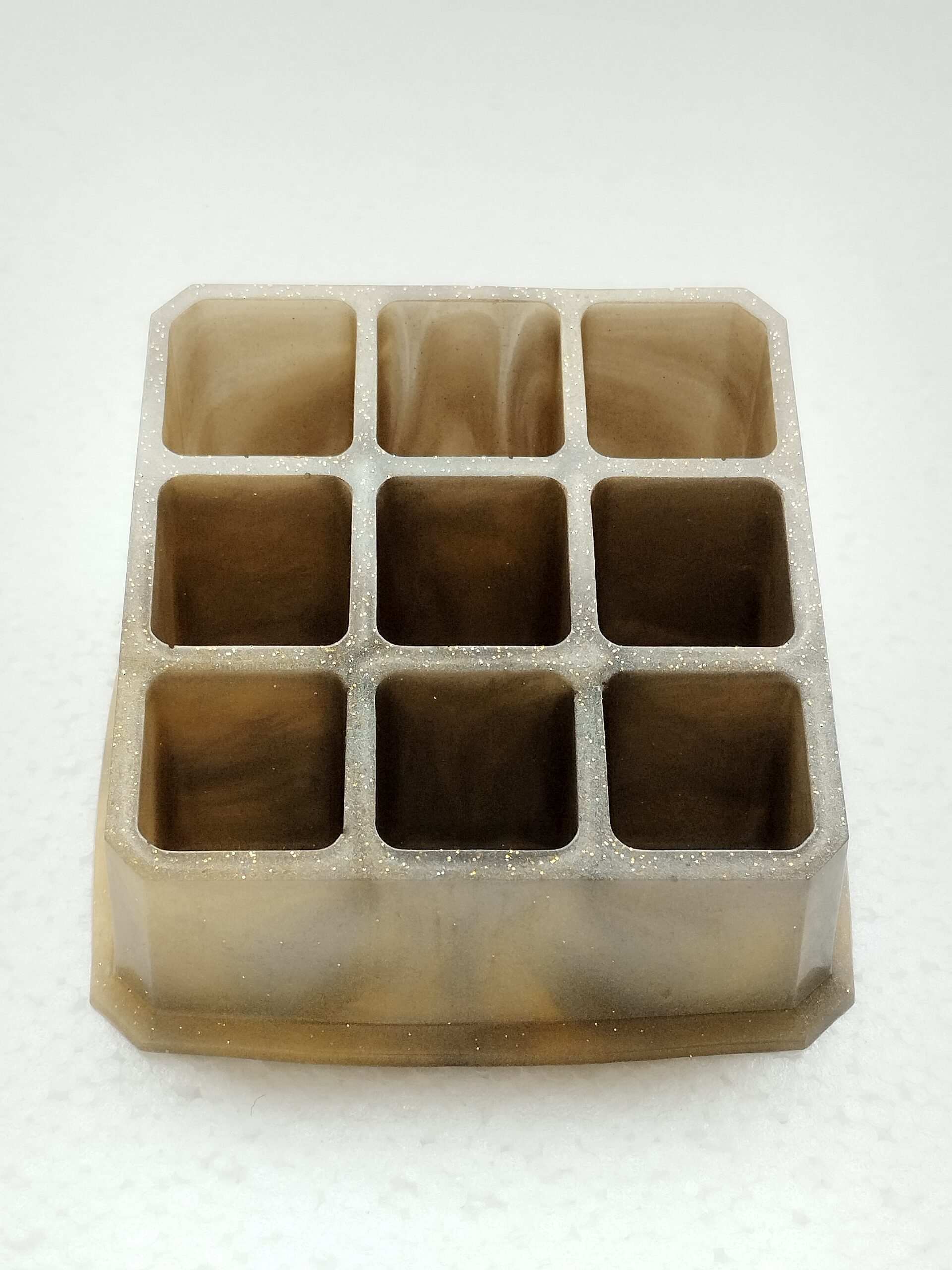 Ajoutez une note chaleureuse à votre espace maquillage avec ce range-rouges à lèvres en résine époxy marron sable. Son aspect marbré naturel, subtilement rehaussé de paillettes fines, évoque l’élégance sobre et intemporelle. Ce modèle unique possède neuf compartiments parfaits pour ordonner vos essentiels beauté avec style.